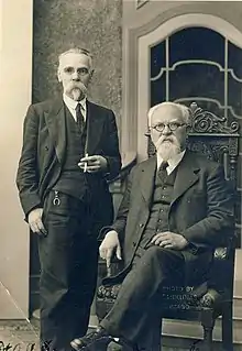 The failure of the Trade and Industry Bank brought financial difficulties, while the death of his wife (4 April 1928) brought a personal loss.[177] He married Grasilda Grauslytė, a sister of his maid and 38 years his junior, in September 1929.[178] His three children strongly disapproved the marriage and the couple moved to his new wife's hometown Palanga where their son Vytautas was born in 1930.[a 5][180] Palanga was transforming from a fishermen village to a popular seaside resort[181] and Šliūpas worked to obtain city rights.[182] In January 1933, he became the first mayor of Palanga.[183] In summer 1933, he hosted the official visit of Robert Baden-Powell, founder of the scout movement.[182] He worked on lowering electricity prices, ensuring street cleanliness, improving transportation (e.g. asking city residents not to use sidewalks to ride bikes or herd cattle), etc.[184] In November 1934,[185] he was replaced by Pranas Kraujelis who was removed in December 1936 for mishandling 30,098 litas of city's funds.[186] From that time until Šliūpas returned as mayor in March 1938, Palanga had only an acting mayor.[187] On 10 May 1938, Palanga suffered a major fire – about 120 residential buildings burned down leaving 1,500 people homeless. Šliūpas had to organize aid, construct shelters, and rebuilt the city with larger more modern buildings.[184][188] About half of the people affected by the fire were Jews who organized a separate relief effort clashing with Lithuanians over the funds. The experience prompted Šliūpas to study Talmud and write an anti-Semitic work.[189] Šliūpas resigned as mayor on 1 July 1939 due to old age and the fact that he, as a recipient of a state pension, could not receive any government wages.[190]