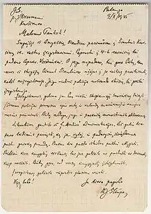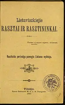 In 1887, faced with constant criticism and attacks, Šliūpas published a Polish-language brochure Litwini i Polacy (Lithuanians and Poles) to explain his ideology on the Polish–Lithuanian question. In this work, he cited the Marxist slogan "Proletarians of all countries, unite!" but did not adopt the concept of class struggle. Loosely interpreting the history of Lithuania, he denounced the exploitation of the Lithuanian people by Polish nobility and Catholic clergy concluding that Lithuania wants to be politically independent.[67] He also translated and published Patkulis, a historical-political drama by the German writer Karl Gutzkow about Johann Patkul, a Livonian nobleman and an instigator of the Great Northern War (1700–1721), who was portrayed as a Latvian fighting for his nation's freedom.[68] He further published a history of Lithuania written by Konstancja Skirmuntt and translated by Petras Vileišis.[69]