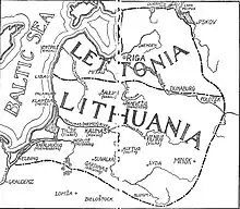 According to Šliūpas memoirs, professor James Young Simpson invited him to the United Kingdom on behalf of the Foreign Office.[151] He arrived to London on 4 February 1919. He delivered speeches on Lithuania's independence to the Union of Democratic Control as well as Lithuanian immigrant communities in London, Glasgow, Burnbank, Edinburgh, Liverpool, Manchester. He also held talks with Latvian activists promoting his ideas of a Lithuanian–Latvia union.[152] When Lithuania sent its official representative Vincas Čepinskis in mid-April 1919, Šliūpas departed to the Paris Peace Conference on 22 May.[153] Together with his son-in-law Yčas, Šliūpas worked to purchase $5 million (equivalent to $84,395,000 in 2022) worth of various military goods from the U.S. Liquidation Commission (instead of transporting various supplies back to United States, the U.S. Army sold surplus goods to other governments and businesses).[154] Šliūpas personally supervised the purchase of medical supplies worth about $500,000 in Saint-Nazaire and accompanied their delivery to Lithuania. It was the first time that Šliūpas returned to Lithuania since 1883.[155] But he did not stay there for long as he was sent as the first Lithuanian diplomatic representative to Latvia in August 1919. With military attaché Ladas Natkevičius, he also represented Lithuania to Estonia.[156] There is little information available on his activities in Latvia. At the time, Latvia was fighting the West Russian Volunteer Army but Lithuania refused to provide aid and Lithuania avoided establishing diplomatic contacts with the Soviet Russia due to its international isolation – positions that Šliūpas appears to have disagreed with.[157][158] He also did not get along with Zigfrīds Anna Meierovics, Latvian Foreign Minister.[159] He resigned in December 1919 and returned to Lithuania.[160]