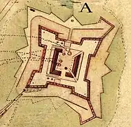 Jonas Moore, probably grandson of Sir Jonas Moore the mathematician, received his commission as probationer engineer in October 1709. On 1 January 1711 he was appointed sub-engineer at Gibraltar and attached to David Colyear, 1st Earl of Portmore, the governor, for special service. According to Vetch, he was later sent to Port Mahon, Minorca, where he remained for some years, only returning to Gibraltar in August 1720.[1] However, Paul Latcham thinks this is a mistake probably resulting from confusion with one James Moore, who was engineer on Minorca from around 1715.[2]
