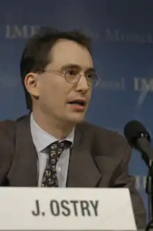 Jonathan David Ostry is an international economist who has served as Deputy Director of the Research Department and Acting Director of the Asia and Pacific Department at the International Monetary Fund in Washington DC.[1][2][3] He is Professor of the Practice in the Department of Economics at Georgetown University in Washington D.C.[4] He is also a Research Fellow at the Centre for Economic Policy Research (CEPR) in London, England, and a Non-Resident Research Fellow at Bruegel in Brussels. His recent work has focused on the management of international capital flows, in particular the role of capital controls; this work has been influential in bringing about a shift in the institutional position of the IMF on capital controls.[5][6][7][8] Ostry has also published influential studies on the relationship between income inequality and economic growth, where his work—which has featured prominently in the financial press[9][10][11]—suggests that high income inequality and a failure to sustain economic growth may be two sides of the same coin. His other work focuses on fiscal sustainability issues (especially the role of a country’s track record of fiscal management in enabling it to access the international capital markets).[1][12] Ostry has many distinguished academic publications, and his work has been cited widely in scholarly journals, and in the press, including The Economist, the Financial Times, The Wall Street Journal, The New York Times and The Washington Post.[5][6][9][10][11][13][14][15] Ostry was listed in Who’s Who in Economics in 2003.[2] He was named one of the 100 most powerful people in global finance by Worth magazine in 2016,[16] and as one of the economists whose research shaped the world in 2017.[17]