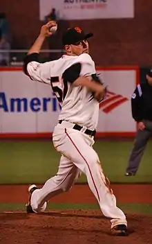 In 2008, Sánchez made the Giants' starting rotation out of spring training as the fifth starter.[23] In only his second start of the season, he struck out a career high ten batters against the San Diego Padres in a game the Giants eventually won 1–0.[24] Sánchez struck out ten batters again in a 3–1 victory against the Cincinnati Reds on April 25, becoming the first Giants left-handed pitcher since Shawn Estes to strike out at least ten batters in a game more than once in a season.[25] From May 28 through June 12, Sánchez won a career best four straight starts.[4] On June 12, in a 10–7 victory over the Colorado Rockies, he became the first Giants' starter to allow seven runs and win a game since Russ Ortiz did it in 2000.[26] In his next start, on June 17 against the Detroit Tigers, Sánchez took a no-hitter into the sixth inning, but he was ultimately the losing pitcher in a 5–1 loss.[27] Sánchez finished the first half with an 8–5 record and 115 strikeouts, which were the most ever in the first half of a season by a Giants' left-hander during the Giants' tenure in San Francisco.[4]