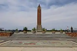 The primary buildings on the Jones Beach site are the two bathhouses (west and east) and the park's large water tower, all built to Moses' specifications. The 188-foot (57 m) water tower, built in 1930 to resemble the bell tower of St Mark's Basilica in Venice, underwent a $6.1 million restoration in 2010.[7][16] Robert Moses' plan originally included two swimming pools available for public use at Jones Beach: The West Bath House pool and the East Bath House pool. While the West Bath House pool has remained open, budget constraints forced the closure of the East Bath House pool in 2009. As part of a $65 million refurbishment of the park announced in 2014,[17] the West Bath House will receive $7 million in improvements; state officials have announced their desire to eventually rehabilitate the East Bath House as well.[18]