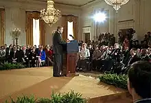 President George W. Bush calls on the Senate to support a ban on human cloning during an address on April 10, 2002. Pictured at center to the right of the lectern is disability advocate Joni Eareckson Tada.