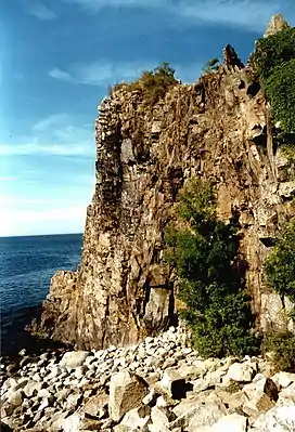 Jons Kapel ("John's Chapel") is a rock bluff in Denmark on Bornholm's west coast, about 7 kilometres (4.3 mi) north of Hasle. The formations are the result of the waves beating against the rock at a time when the sea level was considerably higher than it is today.[1] The cliff is 135 feet (41 m) in height.[2] Named after a hermit who resided on the bluff, Jon's caves are visible from the beach below the rocks.[3]