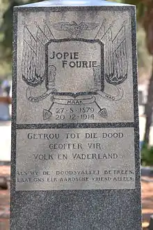 The execution of Fourie was a divisive event in white politics. To Afrikaner believers in republicanism, Fourie was a martyr and Jan Smuts was a traitor. Fourie's court-martial and execution caused massive outrage and was a potent factor in the rise of the National Party.[7] Fourie was one of the martyrs and legends of the Maritz Rebellion which would inspire Afrikaner nationalism long afterwards.[8] The Jopie Fourie Primary School in Pretoria is named after him.[9]