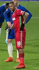 On 22 August 2017, Ayew put up a man of the match performance by scoring a 20-yard strike goal and assisting another for Tammy Abraham's debut goal in Swansea's EFL Cup match against MK Dons.[17][18] His goal 20-yard effort was described by news outlet BBC as a tremendous strike.[18] Ayew scored his first goal in the 2017–18 season, on 26 August 2017, to help The Swans to a 2–0 victory over his future club Crystal Palace.[19] On 17 January 2018, he scored the opening goal in the Swans' 2–1 FA Cup replay match against Wolverhampton Wanderers.[20]