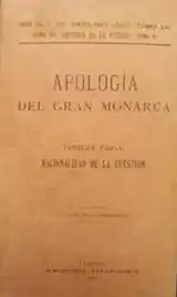 In the early 1900s Corbató developed his own political theory. Auto-identified as españolismo, it was laid out in some 20 booklets[69] published in Valencia between 1900 and 1905;[70] the best known work is Apología del Gran Monarca.[71] Corbató's españolismo was a highly providentialist, millenarian doctrine which combined exalted patriotism and religious zeal. Based on assumption that the global liberal order would undoubtedly collapse[72] it envisioned ultimate advent of a universalist monarchy.[73] In a regenerationist tone Corbató hinted that the impulse might come from Spain, which would regain imperial status as a Hispanic commonwealth.[74] He remained ambiguous as to the future monarch.[75] Scholars reconstruct his españolismo as "a form of anti-liberal Spanish nationalism,[76] founded on ultramontane Catholicism and Traditionalism, with the objective of building a moderate, regionalist monarchy and corporative society".[77] One historian sees Corbató's españolismo as an attempt to modernize Traditionalism;[78] another presents it rather in terms of mysticism and esoterism.[79]