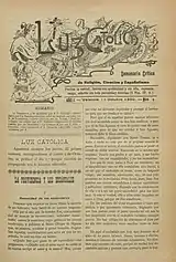 Back in Spain Corbató – by scholars considered possessed by "obsesiva dedicación al campo de la prensa"[60] – resumed labors to launch a new periodical. He obtained some donations from friends and relatives, was prepared to mortgage his Villareal house and contributed his own meager savings to launch Luz Católica, a weekly which was first published in late 1900.[61] This time the periodical did not assume a clear party identity, sub-titled "Semanario critico de religión, ciencias y españolismo".[62] Initially the weekly might have seemed flavored with Carlism, e.g. when it questioned Traditionalist credentials of Polo y Peyrolón,[63] but soon it turned decisively against the party. Posing as a genuine Traditionalist voice, Luz Católica started to castigate cesarism and hypocrisy of Carlos VII and his men, including the party leader Barrio y Miér; they allegedly opted for rapprochement with the Restoration system.[56] In 1903 Luz Católica was revamped as La Señal de Victoria,[62] but its editorial line remained the same.