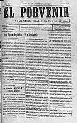 After leaving El Basco Doña Marina shifted his attention to San Sebastián, where in 1898 he launched a local daily El Correo de Guipúzcoa.[66] As its director[67] he maintained Traditionalist profile of the paper, in the early 20th century ridiculed by opponents as "fracasado periodiquero" and representative of die-hard despotic Carlism.[68] None of the sources consulted specifies whether Doña Marina was directing both El Basco and El Correo from Madrid or whether he lived in Bilbao and San Sebastián on the on and off basis; in case of the latter, he ceded editorial duties first to Daniel Aizpurúa and later to Román Oyarzun.[69] Like in Biscay, also in Gipuzkoa the editorial enterprise did not last longer than a decade; at unspecified time Doña Marina withdrew, and El Correo disappeared in the early-1910s.[70] Most authors do not associate him with any other periodical; one scholar, however, claims that in the late 1910s Doña Marina one way or another controlled a Toledo daily El Porvenir, a very ephemeral episode marked by attempt to champion a Mellista line.[71]