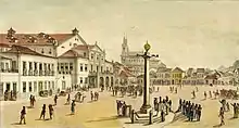 Painting of central Rio de Janeiro (1835) by Debret. The building with a Neoclassical facade and porch that occupies the left of the square is the Royal Theatre of St John, designed by Costa e Silva.