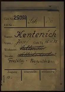 Kentenich came under the protection of the "kapo" (inmate block chief), a communist named Guttmann, after Guttman saw Kentenich sharing his daily bread and soup with another detainee. Guttmann later saved his life; due to poor health, the priest was due to be sent to the gas chamber but Guttmann hid him from the S.S. physician.[5]