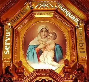 In 1915, a teacher gave Kentenich a picture of the Virgin and Child. The tenderness of Mary's gesture impressed him and he placed the icon above the altar. Venerated under the name Mater ter admirabilis (Mother Thrice Admirable), the picture appears in every Schoenstatt site.[8]