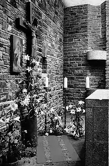 He is buried in the Church of the Adoration. On his tomb, according to his wish, is the inscription: Dilexit Ecclesiam ("He loved the Church"; Eph 5:25[14]). This was influenced by the same inscription engraved on the tomb of Cardinal Gaspard Mermillod, Bishop of Geneva (Switzerland) who was exiled from his own country for 11 years in the 19th century, for refusing to adhere to a national church separated from Rome.