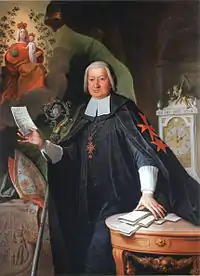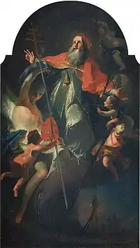 These actions had a serious effect on Winterhalder's livelihood, but he was able to find patronage from the Moravian nobility, decorating several of their mansions with trompe-l'œil ornaments and the like.[1] This period includes his only portrait. In 1796, János Szily, the Bishop of Szombathely, wanted murals for his cathedral. Maulbertsch was the Bishop's first choice, but he was ill (terminally so, as it turned out), so the commission went to Winterhalder.[2] This restored his career, to some extent. The murals were lost during World War II.