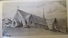 After three design concepts, one of which was highlighted in a 1939 national architectural trade journal,[13] and another for its innovative use of salvaged granite from the planned razing of the Old Post Office (Omaha, Nebraska),[14] Suneg settled on an Anglo-Saxon architecture design with Early English Gothic period details such as a rusticated stone exterior, steep pitched roof, and open nave emphasizing horizontality, simple lines, and fine proportions. Charles Jay Connick of Boston designed the stained glass windows. The architect Leo A Daly was chosen and in May 1941 ground was broken. On Sunday, June 14, 1942 with 800 persons in attendance, Archbishop James Hugh Ryan dedicated the new church. The total cost of the building was approximately $140,000.[15]