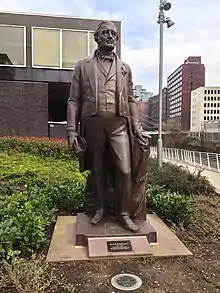 Brotherton died suddenly from a heart attack aged 73 in January 1857, while travelling to a meeting in Manchester.[2] He was buried on 14 January in the new Weaste municipal cemetery, Salford, the first interment at the cemetery he campaigned for, following a two and a half mile long funeral procession.[2] A Joseph Brotherton Memorial Fund was established, and a statue of Brotherton was erected in Peel Park in 1858.[2] The statue was dismantled in 1954 and sold into private ownership in 1969. At the time Salford City Council were looking for any additional revenue and it sold the statue to a scrap metal merchant. He was aware of the rivalry between the two cities so he approached Manchester with the suggestion they might buy it. It was purchased by Manchester City Council in 1986, and was resited at Riverside Walk, overlooking the River Irwell and facing towards Salford. The effect was that he was looking balefully at the city that thought so little of him as to sell his statue. It was relocated onto the Salford bank of the Irwell to make way for a new footbridge linking Salford to the Spinningfield development.[4][5] In May 2018 it was returned to Peel Park and placed on a plinth which was a replica of the original one it ocupied. The statue was listed in December 2023.[6]