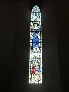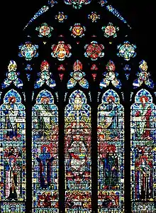 Nuttgens had a long career, producing about 300 stained glass windows entirely by his own hand, as well as countless drawings, designs and glass work for other artists.[3] Most of his windows were for British churches, with a few being for churches all over the world. About two thirds were for Anglican churches, the remainder being for Roman Catholic churches. His work was coherent over time although his style showed considerable development across his long career.[3] His work from the beginning of his professional life at the end of the First World War to near the beginning of the Second World War carries traces of the style, as well as the philosophy, of the Arts and Crafts Movement, see for example, windows in Nottingham Roman Catholic Cathedral (installed 1948)[14] and St Teresa's Roman Catholic Church, Beaconsfield, Buckinghamshire (1938-1944).[10] During the Second World War there was little opportunity to work in stained glass and from time to time Nuttgens was obliged to take on manual labour.[3] After the Second World War, there was more demand for stained glass, especially for War Memorials and other post-war regeneration projects. These projects included, for example, replacing the windows in the bomb-damaged St Etheldreda's Roman Catholic Church in Ely Place, London (1952)[15] where Nuttgens made the large East window and his colleague, Charles F. Blakeman, made the side windows. When viewing its installation, Bernard Rackham (then curator of the Victoria and Albert Museum) described this East Window as an 'excellent illustration of the adaptation to modern ideas of a superb medieval art'.[16] Some of Nuttgens post-war work, such as the south window in St Andrew's Parish Church, Soham, Cambridgeshire (1957)[17] had a bold but colourful simplicity which indicated considerable progression from his pre-war style. Nuttgens gained an international reputation and made windows for a number of churches abroad including St John's Cathedral in Hong Kong (1958).[7] He replaced the windows which had originally been created by William Morris's firm but which were destroyed during the Japanese Occupation of Hong Kong. A few weeks before his death in 1982, Nuttgens completed the designs for a work based entirely on wild flowers[5] which had been commissioned by Linda McCartney (first wife of Paul McCartney). The work was completed by his son, Joe Ambrose Nuttgens.[2]