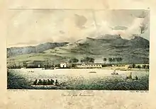 Chapman was a Bouchard crewman during the 1818 attack on Monterey, California. At that point, the tales diverge again. Alta California governor Pablo Vicente de Solá reported that Chapman was one of three prisoners taken from one of Bouchard's two ships, the Santa Rosa, that surrendered after an artillery duel.[7] A first-person account from the Bouchard crew says he was captured by Spanish soldiers during a sortie to the shore.[8] Another variation says he was captured later, during an attack on Rancho Nuestra Señora del Refugio, on the coast north of Santa Barbara.[9] Still another story combines the two, with Chapman first being captured at Monterey, then freed by Bouchard's raiding party, then captured a second time at Rancho Nuestra Señora del Refugio. In a variation of this last, Chapman deserted Bouchard at Refugio and made his way inland to Mission Santa Inez, where he surrendered. A later story, possibly told by a son concerned with family image, ignored the pirate episode altogether and claimed that Chapman entered California after being shipwrecked near San Pedro.[10]