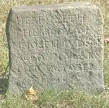 Judson died on October 8, 1690, and his wife Sarah died on March 16, 1696, at Woodbury.[36] They are buried in the Stratford Congregational Burying Ground.[37] An additional cemetery monument for Sarah and Joseph Judson was erected in 1812.[38]