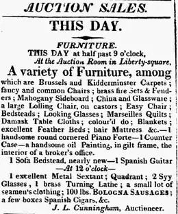 - Furniture; "also - a pair of duelling pistols; ... ebony German flute; ... gold watch; ... 3 boxes French cordials" at "the Julien Auction Room, corner of Milk and Congress-streets"[18]