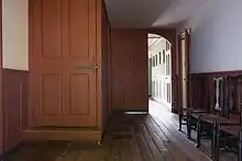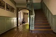The interior continues the sophisticated style of the exterior. Builder Abner Osborne's craftsmanship is illustrated by the formal woodwork and decorated fireplaces. The entrance features a central hallway with fielded paneling and a grand staircase with a mahogany banister and finely-turned balusters. The front central hallway opens up to four large rooms, two on either side.[1] The rooms served multiple functions from business to formal entertaining.[2] A kitchen with a large fireplace is located in the back of the first floor, accessible by a rear service entrance and staircase that was used by the many people the Lloyds enslaved.[3] Lesser quality materials and finishes demarcate the front public spaces and the rear work areas of the house. The front hallway on the second floor mimics the layout of the floor below, with living quarters for the family in the front and a likely enslaved quarter in the back that directly connects to the rear staircase.
