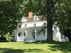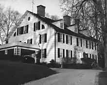 The Joseph Lloyd Manor is situated on a hill on the south side of Lloyd Neck facing what was then Horse Neck Harbor, today Lloyd Harbor. In 1765, Joseph Lloyd commissioned Abner Osborne, a Connecticut carpenter, to build the windows, shingles, interior architectural finishes, and the courtyard around the house.[1] Lloyd Neck was dense with trees, giving the builders an unlimited amount of wood to use for the construction of the house.[2] The structure's symmetry and balanced design reflect the simple elegance of high-style, Pre-Revolutionary architecture. The façade features five bays: a central front door with two, symmetrically spaced windows on either side. The front door is flanked by fluted pilasters with a segmental pediment above. The second floor also features a bay of five windows that correspond with the four windows and door below. When originally constructed, the house design included an uncovered wooden stoop and two symmetrical central chimneys.[2]