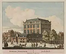 Joseph Penso Felix was born about 1650 into a family of Spanish and Portuguese Jews; it is unknown where.[4] He was the son of Isaac Penso Félix (1608-1683) a merchant, and of Esther de la Vega (-1679). His father was a converso from Espejo, a small town in Córdoba province (Andalusia), who had made a solemn vow in the dungeon of the Inquisition that within a year after regaining his liberty he would openly profess Judaism. This oath he fulfilled in Middelburg after his escape to Antwerp.[5] He moved to Hamburg, where he married Esther de la Vega; Sara, their first child, was born there in 1645. In 1655 he was appointed parnas, not long after the family settled in Amsterdam.[6] According to the marriage certificates in the Amsterdam City Archives, Joseph had three younger brothers and four younger sisters: Abraham Penso Felix (ca 1656-1710) was a schoolmaster, a diamond seller and traded in slaves;[7][8] David (1654-) and Raphael Penso (ca 1659-) were merchants, who moved to London; Jochebet Pensa (1655-1718), Ribca Penso (1662-1720), Abigail Penso (ca 1663-1708) and Lea Pensa (1664-1710) lived in Amsterdam.[9]