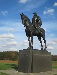 [A] Herculean Jackson sits tall upon an equally muscular horse as he gazes out across Henry Hill. He wears a cape that appears to be lifted by a dramatic wind, lending itself to his heroic stance. The large lettering on the base of the monument boldly declares, "There Stands Jackson Like a Stone Wall," referencing the words purportedly spoken by General Bernard Bee at the Battle of first Manassas, immortalizing Jackson with his nickname.[13]