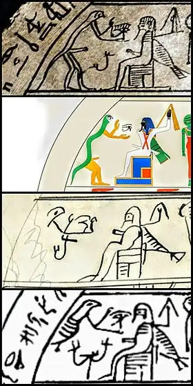 The seated figure has been identified with the fertility god Min[1] (often syncretized with Amun)[18][13] who is holding a flail. LDS and non-LDS scholars agree the depiction appears to be an ithyphallic figure (i.e. depicted with an erect penis).[18][19] LDS scholar Hugh Nibley stated that in Egyptian mythology Min was said to behave "with shocking promiscuity ... indulging in incestuous relationships with those of his immediate family" such as his sister wife Isis.[20] To the left is a figure identified as the serpent god Nehebkau with a falcon head (also commonly depicted as ithyphallic), presenting the Eye of Ra.[13][1]