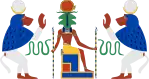 A cow, representing Hathor, the heavenly cow.[13] Behind is a standing female figure with the Eye of Horus depicted on her head and holding out a water lily in her left hand.[13]