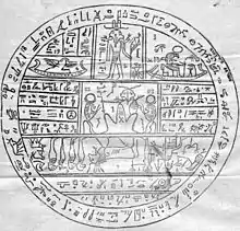 Within the large circle of hypocephali are compartments containing hieroglyphic text and figures which are extracts from Chapter 162 of the Egyptian Book of the Dead.[10] Historian P. J. de Horrack stated that the scenes portrayed in hypocephali relate in all their details to the resurrection and the renewed birth after death...symbolized by the course of the Sun, the living image of divine generation. The circle is divided to represent two celestial hemispheres and the cycle of renewal.