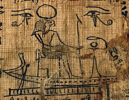 A falcon, representing Sokar[1][13] sitting on a mummy case, with outstretched wings, sitting upon a papyrus boat. The Coffin Texts state: "He takes the ship of 1000 cubits from end to end and he sails it to the stairway of fire."[1]