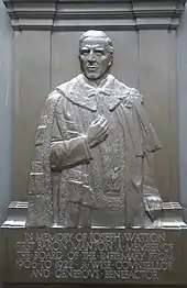 In 1921 Watson donated £50,000 to the Leeds General Infirmary, of which he was a board member from 1906 to his death. The monies were used to replace some of its investments which had to be sold during WWI.[28] A half-length bronze bas-relief portrait of Watson in his baronial robes is displayed there in the George Street entrance hall, under which is inscribed A Wise Counsellor and Generous Benefactor.