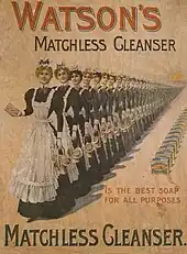 - ↑ Watson was amongst the first of the established manufacturers to follow Lever's heavy advertising and revolutionary marketing techniques,[lower-alpha 1] offering prizes such as day trips to Brighton and visits to Paris to view the Grecian sculpture Venus de Milo, in exchange for soap wrapper returns. In 1885 production had been 100 tons per week, which rose fivefold by 1906. One of the by-products was glycerine, sold for the manufacture of explosives. The company, known locally as "Soapy Joe's" was based after 1861 at the Whitehall Road Soapworks, Leeds, strategically placed between the River Aire, from which palm oil shipped in from around the world was unloaded, and the former railway terminal, from which the finished product was dispatched. It became one of the largest employers in the city, producing brands such as "Matchless Cleanser", "Venus" and "Nubolic".