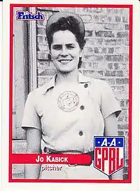 Josephine Kabick [Jo] (March 27, 1922 – February 8, 1978) was an American female pitcher who played from 1944 through 1947 in the All-American Girls Professional Baseball League. Listed at 5 ft 7 in (1.70 m), 142 lb., Kabick batted and threw right-handed. She was born in Detroit, Michigan.[1][2]