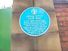Aged 29, Tetley married Hannah Carbutt on 12 March 1808 at Sheffield Parish Church. Carbutt was from an affluent family which included former Mayors of York and Leeds.[9] They settled in a house on Park Square in Leeds. In 1822, aged 44, Tetley leased William Sykes' Brewery in Salem Place, Hunslet.[5] Unusually for the time, Tetley head hunted staff, looking only for the most skilled brewers and maltsters from as far away as Manchester. Once the brewery was established it became the second largest in Leeds and had an estimated value of £22, while Robert Arthington's brewery held an estimated value of £100.[10] Following the passing of the Beer House Act of 1830, Tetley's business grew and his recently acquired ale houses opened between 4 am and 10 pm. The temperance movement approved beer as a temperate alternative to spirits, which led to the growth of many small breweries. When Tetley's father William Tetley died in 1834, Joshua received (according to William's 1820 will) £450 worth of his assets, much of which was invested in the Tetley business.[11]