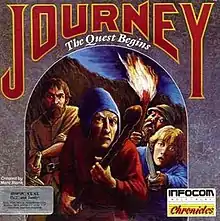 Journey: The Quest Begins is an interactive fiction computer game designed by Marc Blank, with illustrations by Donald Langosy, and released by Infocom in 1989.[1] Like the majority of Infocom's works, it was released simultaneously for several popular computer platforms, such as the Commodore 64, Apple II, and PC. Journey is unusual among Infocom games in that it could be played entirely via mouse or joystick, with no typing required. It was the thirty-fifth and last game released by Infocom before parent company Activision closed the Cambridge office, effectively reducing Infocom to a "label" to be applied to later games.