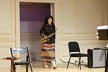 Harjo uses Native American oral history as a mechanism for portraying these issues, and believes that "written text is, for [her], fixed orality".[28] Her use of the oral tradition is prevalent through various literature readings and musical performances conducted by Harjo. Her methods of continuing oral tradition include storytelling, singing, and voice inflection in order to captivate the attention of her audiences. While reading poetry, she claims that "[she] starts not even with an image but a sound," which is indicative of her oral traditions expressed in performance.[29]