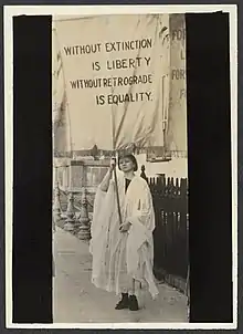 On May 1, 1916, she delivered a basket of flowers to President Woodrow Wilson, which also contained a request for a suffrage amendment and pro-suffrage messages from women from the western half of America.[3][4]