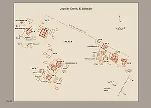 Joya de Cerén can be divided into a northeastern area, a southeastern area, and northwestern area.[16] The northwestern area holds Household 1 alongside Structure 1, 5-6, 10-12, 17 containing milpas and a kitchen garden. The southeastern area holds Household 2 alongside Structure 2, 7, 9, 13, 18 containing a temascal, milpas and a basurero (trash pit). The northwestern area holds Household 3-4 alongside Structure 3-4, 8, 14-16 containing milpas, fruit trees, and another basurero.[16] 18 structures have been identified in archaeological survey. Of these, ten have been excavated by archaeologists.[17] Scholars distinguish ceremonial buildings from non-ceremonial buildings with the following considerations: orientation of building, platform heights, floor plans, assemblages, construction technique, altars, caches, burials, etc.[18]