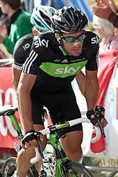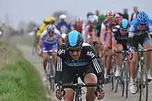 In 2010, he joined Team Sky. At the beginning of the season, he participated in his squad's victory at the Team time trial of the Tour of Qatar.[19] He got his first major one-day race victory with his new team in the Omloop Het Nieuwsblad, becoming the first Spanish rider to win the event. He counter-attacked Philippe Gilbert on a cobbled section before making a 20 kilometres (12 mi) solo effort for the finish. He dedicated the win to his team and to his former teammate Frank Vandenbroucke who died in October 2009.[20] In March he took the third step of the podium in the E3 Prijs Vlaanderen behind eternal classic rivals Tom Boonen and Fabian Cancellara. The three of them had broken clear with more than 25 kilometres (16 mi) to cover and cooperated to keep the chasers at bay, until Cancellara launched an attack with 2 kilometers remaining and won the race with a sizable gap. Flecha was out sprinted by Boonen for the second place.[21] Two weeks later at Paris–Roubaix, he took another third place after breaking away from the chasers with Thor Hushovd in a vain attempt to reach Cancellara. The latter escaped shortly before the cobbled sector Mons-en-Pévèle and would be untouchable on that day, while Hushovd's sprinting speed proved too much for Flecha.[22] Tom Boonen was upset that Flecha and the chasing group didn't bring back Cancellara in a concerted effort and made comments to that effect, but he didn't follow Flecha and Hushovd when they attacked.[23]
