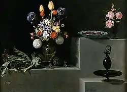 One good example of his work as a flower painter is his Offering to Flora,[3] a visual poem that parallels the lyric verse of his time, in which he united his skills as portraitist and flower painter to produce one of the most beautiful paintings of the allegory of spring. The large canvas, painted in 1627, shows the goddess of the flowers seated besides a cornucopia of spring flowers. The painting adopts a Flemish compositional type and reveals an interest in the play of light on iridescent fabrics that probably derived in the style of Juan Bautista Maino. The offering to Flora and the pair of paintings Still Life with a Vase of Flowers and a Dog and Still Life with a Vase of Flowers and a Puppy formed part of the interior decoration of Jean de Croy's palace in Madrid. Jean de Croy, conde de Solre and Diego Mexia, marqués de Leganés, were Van der Hamen's greatest patrons.
