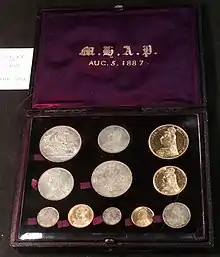 In May 1888 Fremantle reported that, though "the issue of the new coins was received with some adverse criticism", there had been a considerable demand for them – well above what was needed for circulation, leading to the largest number of silver coins issued in several years.[48] Beyond the sixpence, there was no immediate move to replace the Jubilee coinage; the numismatist, Jeffery L. Lant, explained that "the Jubilee coinage was popular with the public notwithstanding the criticism directed against it. It constituted, initially, the best form of Jubilee keepsake".[49] He pointed out that the Royal Mint sold 1,881 proof sets of the 1887 Jubilee coinage at a price of 11 guineas (£11 11s, that is, eleven pounds and eleven shillings or £11.55 in decimal reckoning), about 25 percent above the face value, and the demand for the sets and for the Jubilee medal bearing a similar bust of Victoria by Boehm was such that work was not completed until the end of 1888. The Royal Mint was so busy striking Jubilee coins that extra money for labour costs had to be requested. These factors made it easy for the Royal Mint to wait until some time after the Jubilee to consider a replacement.[49] Goschen wrote to Ponsonby in September 1889, "As the general discussion on the Jubilee coinage had subsided, and the public appeared to have got used to the new coin, I thought that it might possibly be best to let the matter rest for a while."[50]