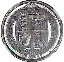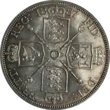 For the various reverses, according to Dyer and Gaspar, "Fremantle had revived some of the finest heraldic designs from the past".[16] He felt that a reverse design with the denomination inside a wreath was "feeble", and sought artistic designs.[16] Fremantle selected designs originating with the Great Recoinage of 1816–1817 or even further back, and these were engraved by Wyon.[17] In 1873, soon after he had assumed the deputy mastership, Fremantle had secured the return of Benedetto Pistrucci's 1817 design of Saint George and the Dragon to the sovereign,[16] for the first time in almost half a century.[18] This design appeared on the gold sovereign, double sovereign and five-pound piece of the Jubilee coinage, and also on the silver crown, or five-shilling piece.[19] Beginning with the Jubilee coinage, a plume was restored to Pistrucci's design; it had featured in his original work, but had later been omitted.[20] The sixpence, shilling, florin, half crown, half sovereign and a new coin, the double florin, were given variations of the ensigns armorial of the United Kingdom. This was done in several guises: thus, according to the proclamation making them current that was issued in May 1887, the half sovereign had a "garnished Shield surmounted by the Royal Crown" while on the half crown, they were "in a plain Shield surrounded by the Garter, bearing the Motto 'Honi soit qui mal y pense' and the Collar of the Garter".[19] The half sovereign's reverse design was a slight modification to those of earlier Victorian half sovereigns, and its crowned shield did not differ much from designs used since the denomination had originated in 1817.[21] Each of the reverses for the sixpence and above carried the date of minting, but none carried a statement of the coin's monetary value.[22] The sixpence had borne a wreath surrounding a statement of its value since 1831,[23] with one reason for this being that it was the same size as the half sovereign, and was sometimes fraudulently plated to pass as one.[7]
