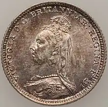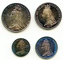 The Jubilee coinage or Jubilee head coinage are British coins with an obverse featuring a depiction of Queen Victoria by Joseph Edgar Boehm. The design was placed on the silver and gold circulating coinage beginning in 1887, and on the Maundy coinage beginning in 1888. The depiction of Victoria wearing a crown that was seen as too small was widely mocked, and was replaced in 1893. The series saw the entire issuance of the double florin (1887–1890) and, in 1888, the last issue for circulation of the groat, or fourpence piece, although it was intended for use in British Guiana. No bronze coins (the penny and its fractions) were struck with the Jubilee design.