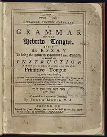 Monis continued to use his handwritten grammar manual, but the unavailability of any Hebrew type for printing presses required that each student copy the entire text by hand, an unpopular job which took up to a month.[11] Monis finally persuaded Harvard to import Hebrew type from London, and in 1735, with a loan from Harvard,[12] Bostonian Jonas Green published a thousand copies of the textbook,[11] the first Hebrew textbook printed in North America. Monis sold the books himself out of his Cambridge home, and it was a required text for all Harvard students for the ensuing 25 years.[11] The American Jewish Historical Society possesses two copies of the printed books, as well as one of the handwritten copies.