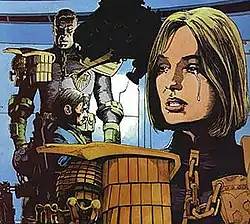 John Wagner created both Judge Death and Judge Anderson for the Judge Dredd story "Judge Death,"[1] the latter helping introduce the Psi-Judges, which were seen as a natural progression.[2] A popular misconception is that artist Brian Bolland based the character on Debbie Harry, due to the mistaken belief that he had recently drawn the singer into an advertisement for the Forbidden Planet 2 store in London. 2000 AD's former editor Kelvin Gosnell has recounted that the comic's assistant editor Deirdre Vine at the time was the inspiration for the character, having been surreptitiously photographed across the office and the snap then given to Bolland who was told to, "Make Anderson look like that."[3][4]