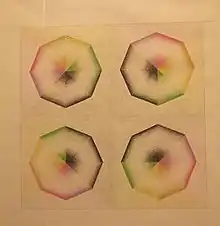 With Arlene Raven and Sheila Levrant de Bretteville, Chicago co-founded the Los Angeles Woman's Building in 1973.[29] This art school and exhibition space was in a structure named after a pavilion at the 1893 World's Colombian Exhibition that featured art made by women from around the world.[30] This housed the Feminist Studio Workshop, described by the founders as "an experimental program in female education in the arts". They wrote: "our purpose is to develop a new concept of art, a new kind of artist and a new art community built from the lives, feelings, and needs of women."[18][31] During this period, Chicago began creating spray-painted canvas, primarily abstract, with geometric forms on them. These works evolved, using the same medium, to become more centered around the meaning of the "feminine." Chicago was strongly influenced by Gerda Lerner.[20]