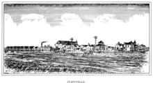 By the turn of the century, Judy's farm in Liberty Township (already known by that time as Judyville) had become an industrial village containing "six barns, one of them being the largest in Warren County, thirteen dwelling houses, a hotel, an office building and numerous outbuildings ... provided with telephonic communication, there being ten distinct lines of operation.".[3] The site being remote, Judy convinced the Chicago and Eastern Illinois Railroad to build an eight-mile-long rail line to his farm from their trunk in Vermilion County, Illinois, and also minted a limited form of currency known as "Judy Money" which was accepted both in the village and throughout the Warren County area.[4]
